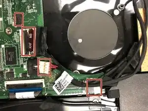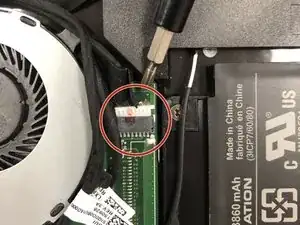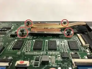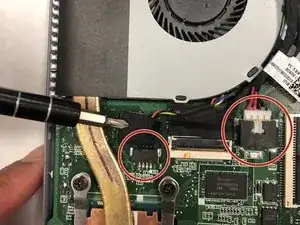 Снимите заднюю крышку Chromebook и найдите радиатор и подключенный вентилятор.