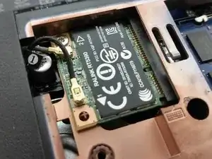 Чтобы снять материнскую плату, необходимо удалить беспроводную карту. Отверните один серебристый винт с крестообразным шлицем, фиксирующий карту, снимите каждую антенну с её разъёма ногтями, вытащите карту и отложите её в сторону.