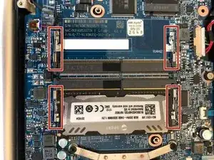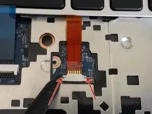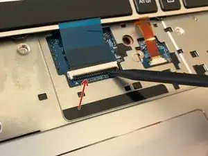 (Синий кабель) Поднимите тонкую чёрную часть на разъёме и осторожно вытащите синий шлейф, пока он не выйдет.