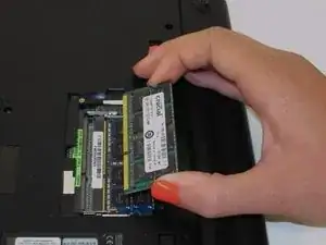 Чтобы заменить оперативную память, возьмите новую планку за края, при этом золотая кромка должна быть обращена вниз к устройству.