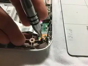 Разожмите защёлку, фиксирующую кабель кнопки питания.