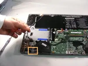 Удалите разъем питания из отведенной области с боковой стороны компьютера, выделенной оранжевым.