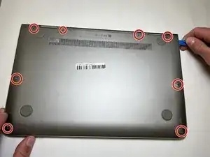 Используйте пластиковый инструмент для открытия, чтобы приподнять нижнюю крышку ноутбука.