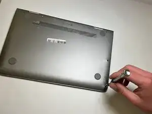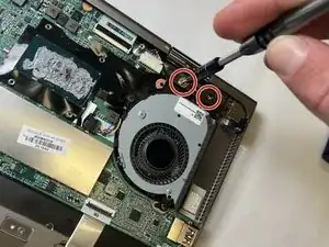 Используйте отвертку JIS #0, чтобы убрать винт длиной 4.2 мм, расположенный прямо под разъемом питания.