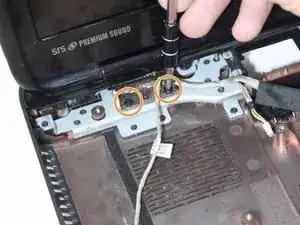 Используйте крестовую отвертку #0, чтобы вывернуть два пять миллиметровых винта с левой стороны основания экрана.