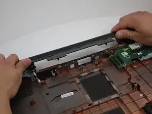 Переверните ноутбук. Аккумулятор будет находиться вверху по центру.