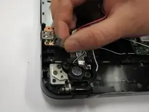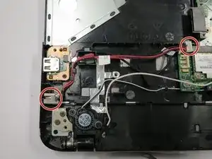 Под проводами находятся пластиковые корпуса, фиксирующие провода. Удалите красный и чёрный провода, соединяющие DC-разъём с 4-контактным питанием, вынимая их из-под пластиковых корпусов.