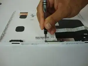 Осторожно отсоедините белый ленточный кабель от материнской платы.