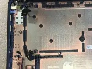 Отрежьте кусок упаковочной ленты и приклейте им заменённый кабель DC IN к нижней пластиковой сборке.