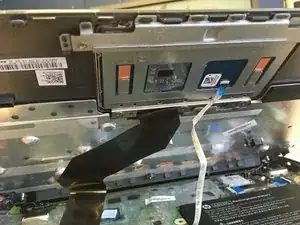 При подъёме подставки для ладоней ленточный кабель тачпада (у меня белый) будет приклеен к нижней стороне подставки. Аккуратно оторвите кабель от клея, чтобы получить к нему доступ.