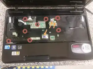Удалите восемь винтов M2.5x6.5, фиксирующих верхнюю панель (palmrest) к корпусу.
