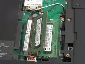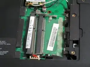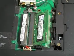 Теперь можно просто поставить ноутбук на левый бок, вынуть разъём из места, где была крышка для памяти, и затем выдернуть разъём питания из клеевого крепления.