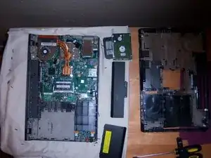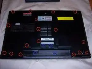 Удалите винты. Внимание: Большинство винтов одинакового размера, но некоторые могут отличаться в зависимости от точной модели. У меня рядом с разъёмом Ethernet был больший винт, и два маленьких винта — ближе к середине отсека аккумулятора. Запомните положение винтов разного размера.