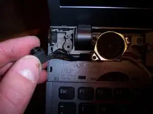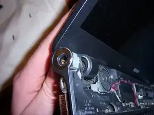 Теперь аккуратно защёлкните решётку динамика на место, переверните ноутбук на спину и уложите провода разъёма питания так же, как были раньше.
