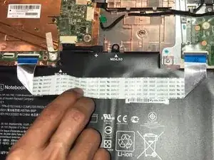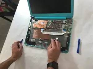 Отогните чёрную пластиковую защёлку ZIF-коннектора, удерживающую кабель клавиатуры, с помощью пластикового инструмента для вскрытия.