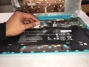 Отогните чёрную пластиковую защёлку, удерживающую кабель аккумулятора, с помощью пластикового инструмента для вскрытия.