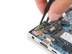 Используйте острый край лопатки или ноготь, чтобы поочерёдно нажимать с обеих сторон на движущийся разъём питания, чтобы полностью вывести его из гнезда рядом с левым шарниром.