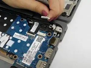 Поднимите узел клавиатуры, чтобы открыть доступ к двум ленточным кабелям.