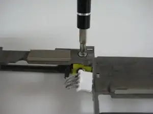 Удалите два винта в правом верхнем углу, которые закрепляют серую металлическую рамку.