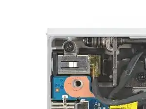 Используйте острый конец лопатки или ноготь, чтобы поочерёдно нажимать с разных сторон на скользящий разъём разъёма питания, чтобы полностью вывести его из гнезда рядом с левой петлёй.