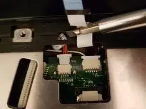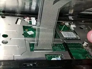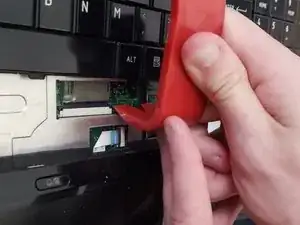 Клавиатура закреплена ленточным кабелем. Используйте пластиковый инструмент, чтобы нажать на маленькую чёрную защёлку, удерживающую кабель, затем аккуратно извлеките ленту.