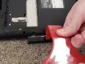 Используйте пластиковую лопатку, чтобы поддеть оптический привод и извлечь его. Это будет легко, поскольку винты, удерживающие привод, уже сняты.