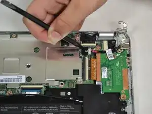 Нажмите на белую защёлку острым концом лопатки и аккуратно вытяните провода из разъёма, потянув горизонтально от защёлки, чтобы отключить разъём зарядки от материнской платы.