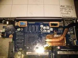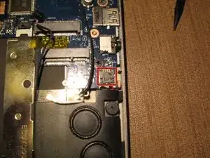 Снимайте материнскую плату очень осторожно, так как лентовый кабель кнопки питания все еще подключен к левой нижней стороне платы. См. шаг 21.