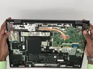Удерживая шарниры на месте, слегка откройте ноутбук, перевёрнутый экраном вниз.