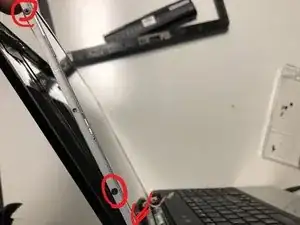 Удалите резиновые накладки со винтов рядом с двумя петлями экрана, используя металлическую лопатку.