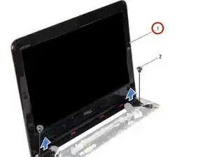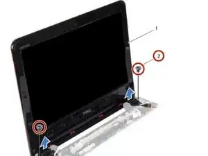 Удалите два винта (по одному с каждой стороны), которые крепят сборку дисплея к корпусу компьютера.