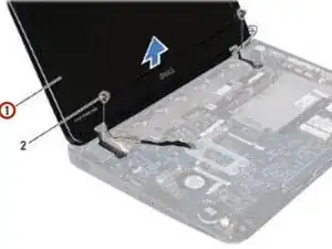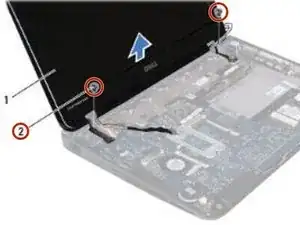 Удалите два винта (по одному с каждой стороны), которые крепят сборку дисплея к корпусу компьютера.