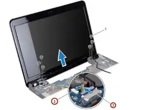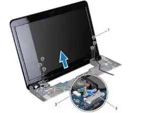 Удалите шесть винтов (по три с каждой стороны), которые крепят сборку дисплея к корпусу компьютера.