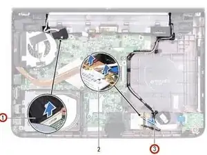 Обратите внимание на прокладку кабеля дисплея и кабелей антенны Mini-Card и удалите кабели из направляющих.