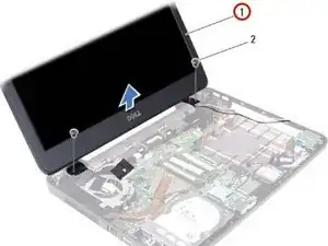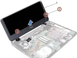 Уберите два винта, которые крепят сборку дисплея к базе компьютера.