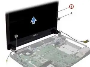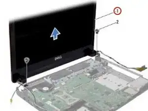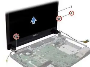Удалите два винта, которые крепят сборку дисплея к основанию компьютера.