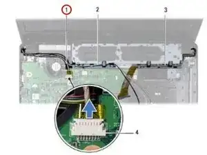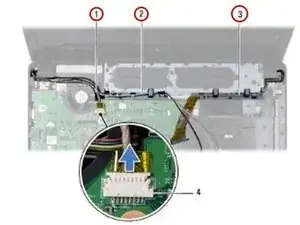 Запомните расположение антенн Mini-Card, кабеля камеры и кабеля дисплея, и извлеките кабели из проводящих направляющих.