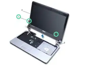 Удалите два винта на основании компьютера, которые крепят сборку дисплея к основанию компьютера.