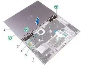 Установите два винта (M2.5x7), которые крепят сборку дисплея к подлокотнику и сборке клавиатуры.