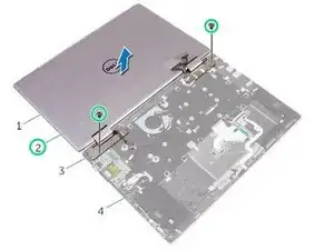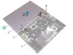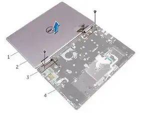 С дисплеем вниз выровняйте отверстия для винтов на петлях дисплея с отверстиями для винтов на сборке подлокотника.