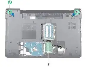 Снимите два винта на нижней части компьютера, которые крепят сборку дисплея к основанию компьютера.