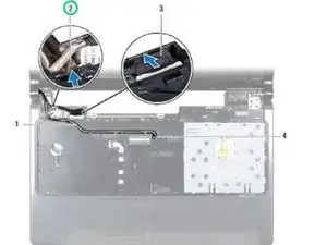 Отметьте прокладку кабелей антенны Mini-Card и снимите их с направляющих на подставке для ладоней.