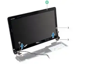 Удерживая сборку дисплея на месте, снимите три винта, которые крепят сборку дисплея к основанию компьютера.