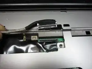 Пальцами аккуратно подденьте вверх два золотых контакта, удерживающих кабель соединения, чтобы освободить его. Они расположены в верхнем левом углу корпуса рядом с петлёй дисплея.