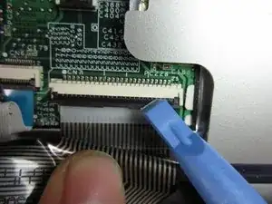 Пластмассовым инструментом для открытия подденьте вверх разъём кабеля дисплея. Он освободится при минимальном усилии.
