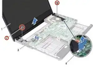 Удалите два винта (по одному с каждой стороны), которые закрепляют сборку экрана к основанию компьютера.