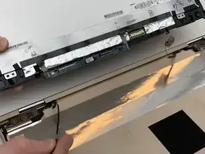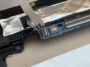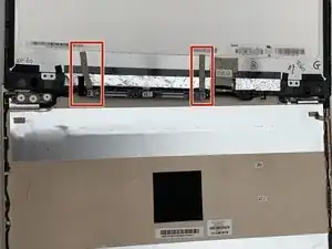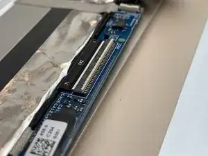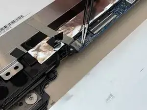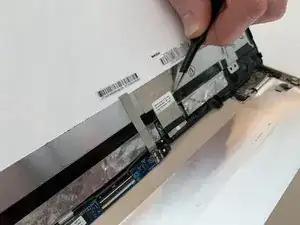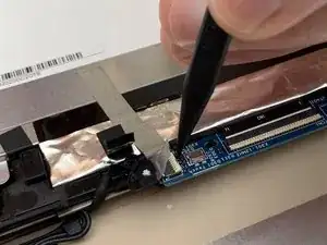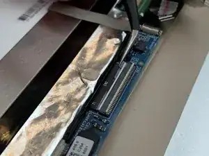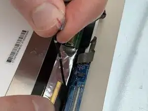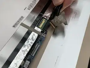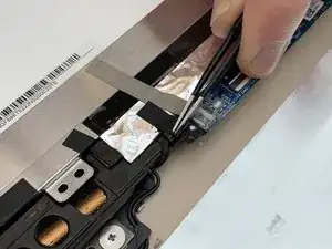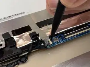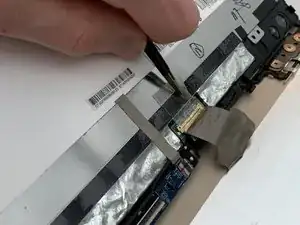 Используя тупые пинцеты, снимите чёрную ленту, закрывающую соединительный кабель между экраном и остальной частью ноутбука.