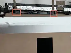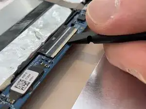 Используя заострённый конец пластикового лопатки №3, отогните защёлку на двух ZIF-разъёмах, которые соединяют материнскую плату с линией индукции ориентации и сенсорной линией.