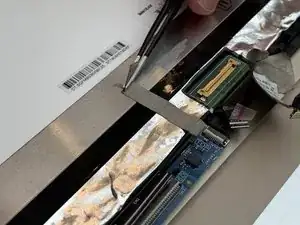 С помощью тупых пинцетов снимите большой кусок серой ленты, закрывающей разъём ЖК-дисплея.