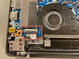 Откройте чёрный фиксатор на разъёме дисплея и аккуратно выньте шлейф параллельно материнской плате. НЕ тяните вверх!